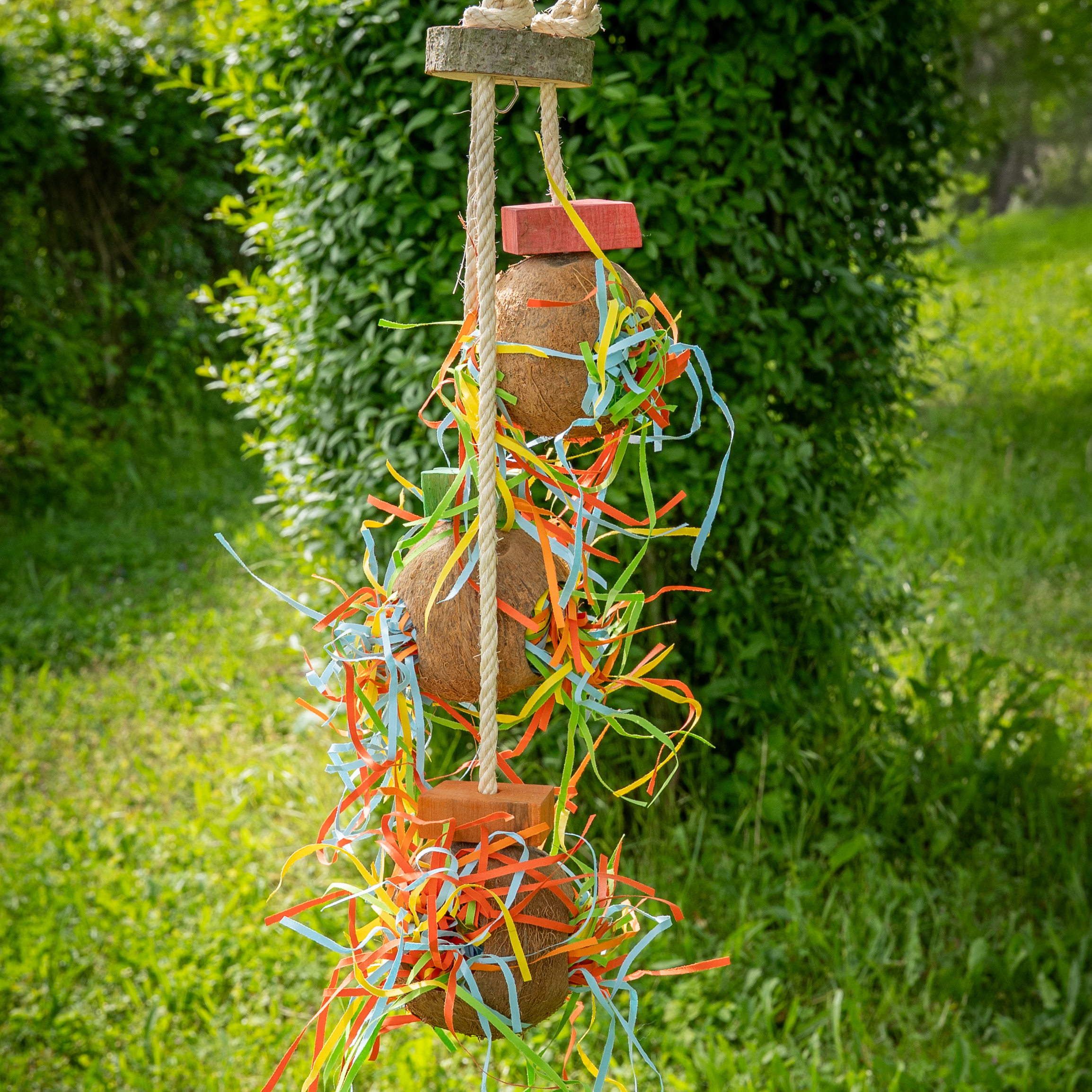 Tolles Hängespielzeug mit drei Kokosnüssen zum verstecken von Futter oder Leckerbissen.