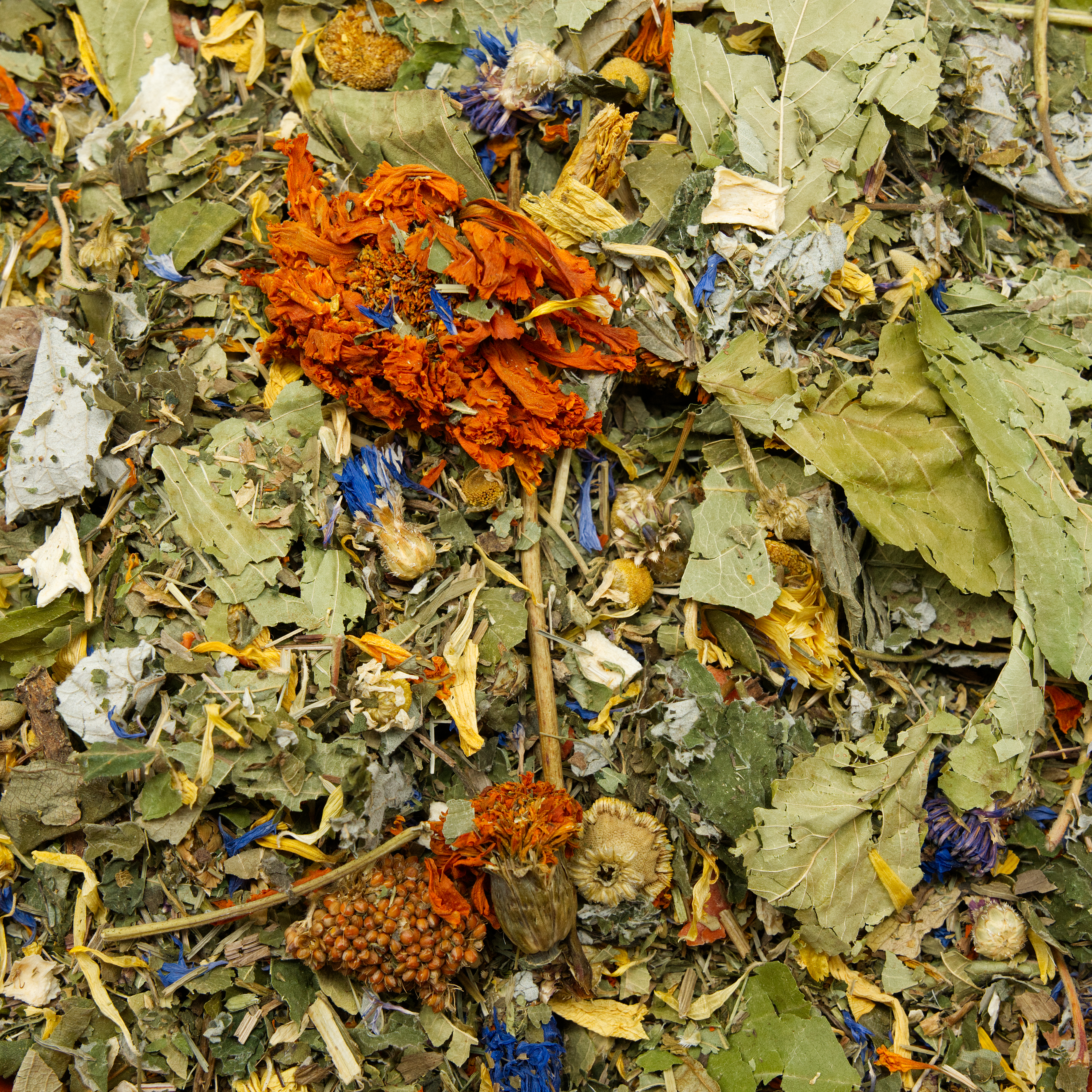 Ackerschachtelhalm, Spitzwegerich, Brennnesselkraut, Löwenzahnkraut, Haselnussblätter, Kolbenhirse im Stück, Apfelblätter, Kornblumenblüten, Erdbeerblätter, Himbeerblätter, Kirschblätter, Löwenzahnwurzeln , Kamillenblüten, Tagetesblüten, Ringelblumenblüten, Möhrenwürfel, Pastinakenwürfel, Sonnenblumenblüten, Vogelmiere, Basilikum, Weißdornblüten