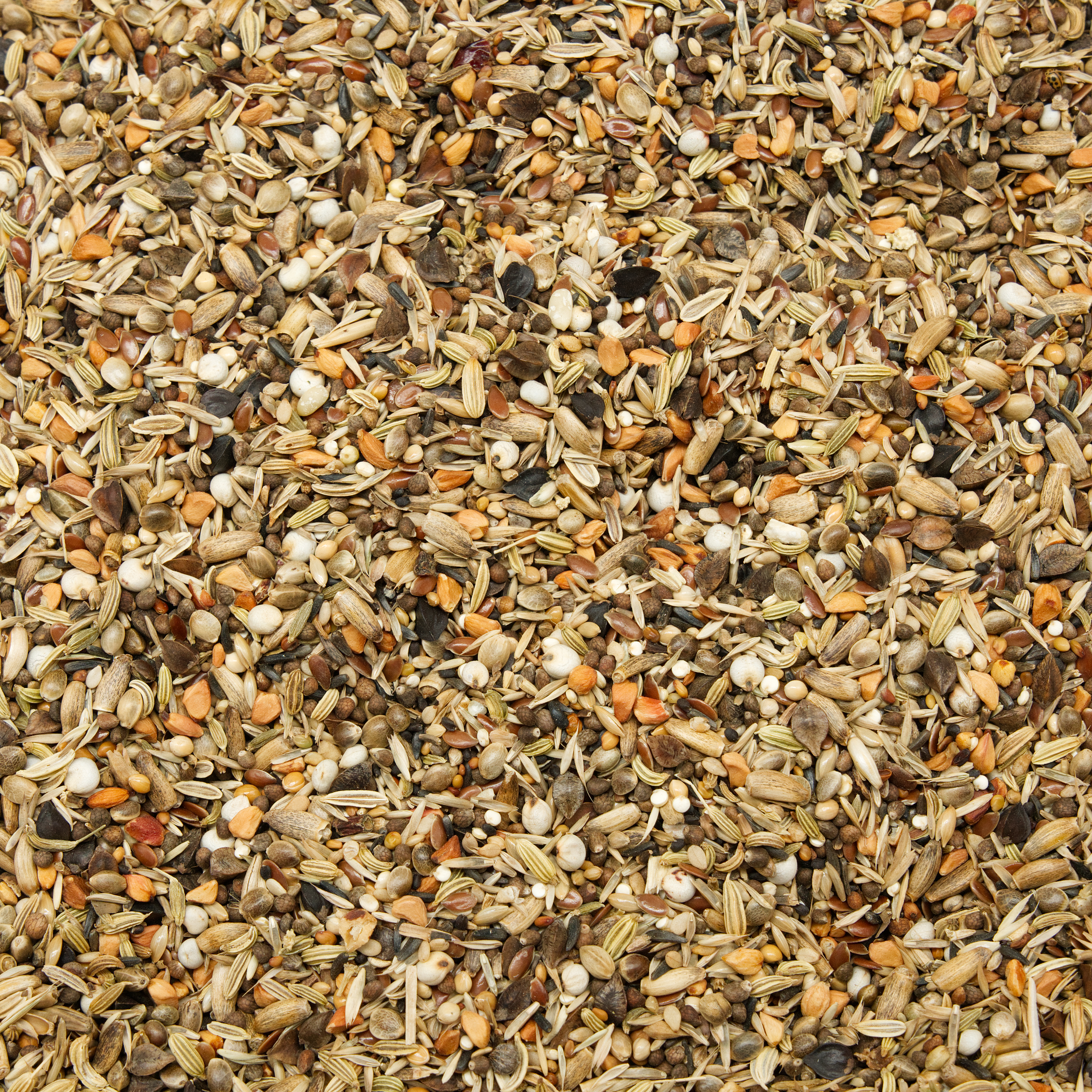 Basismischung, Hagebuttenkerne, Mariendistelsamen, Leinsamen, Hanfsaat, Kleesaat, Dari, Knaulgras, Wiesengräser, Quinoa, Fenchelsaat, Sesam, Buchweizen, Perilla, Nigersaat , Basilikumsaat, Zichhoriensaat
