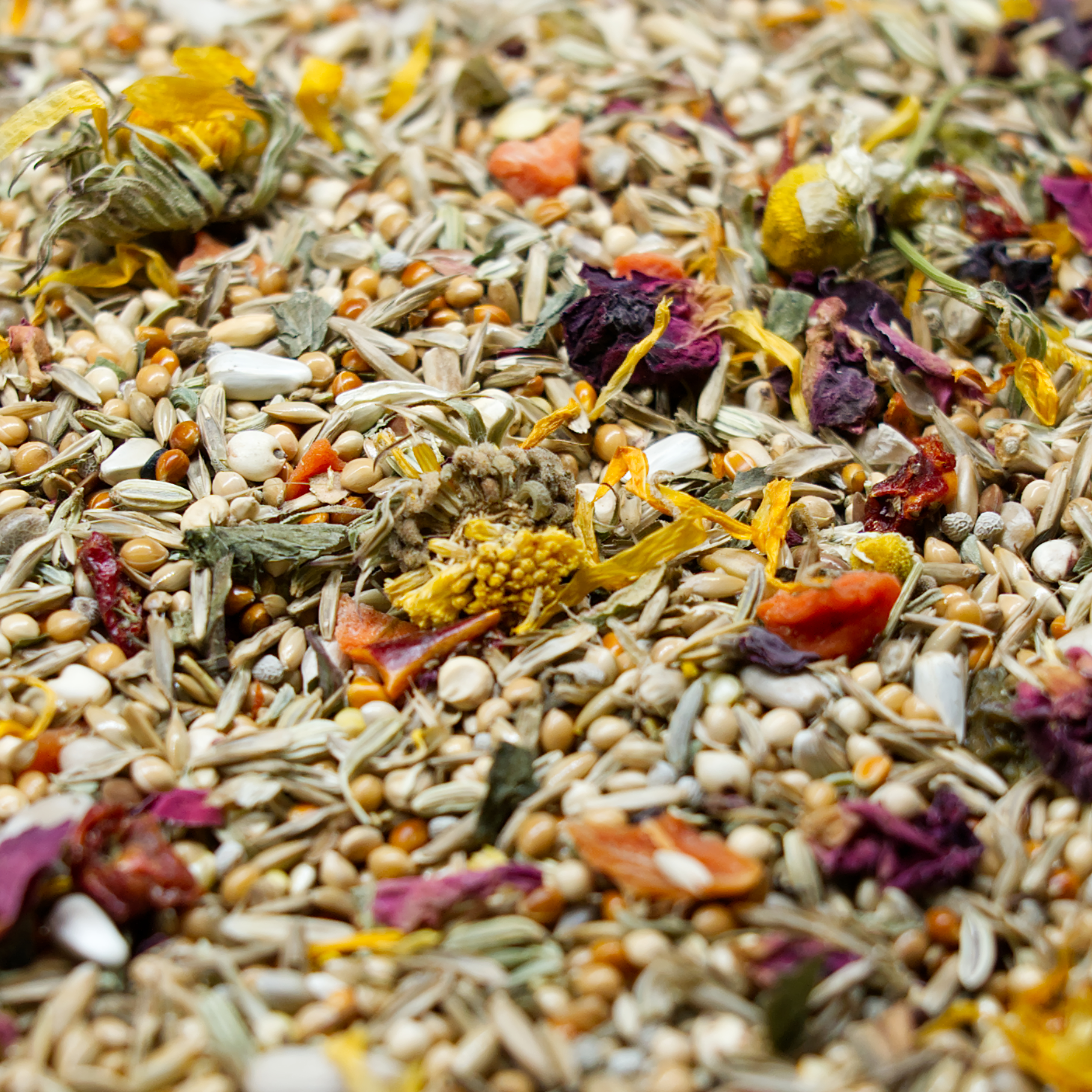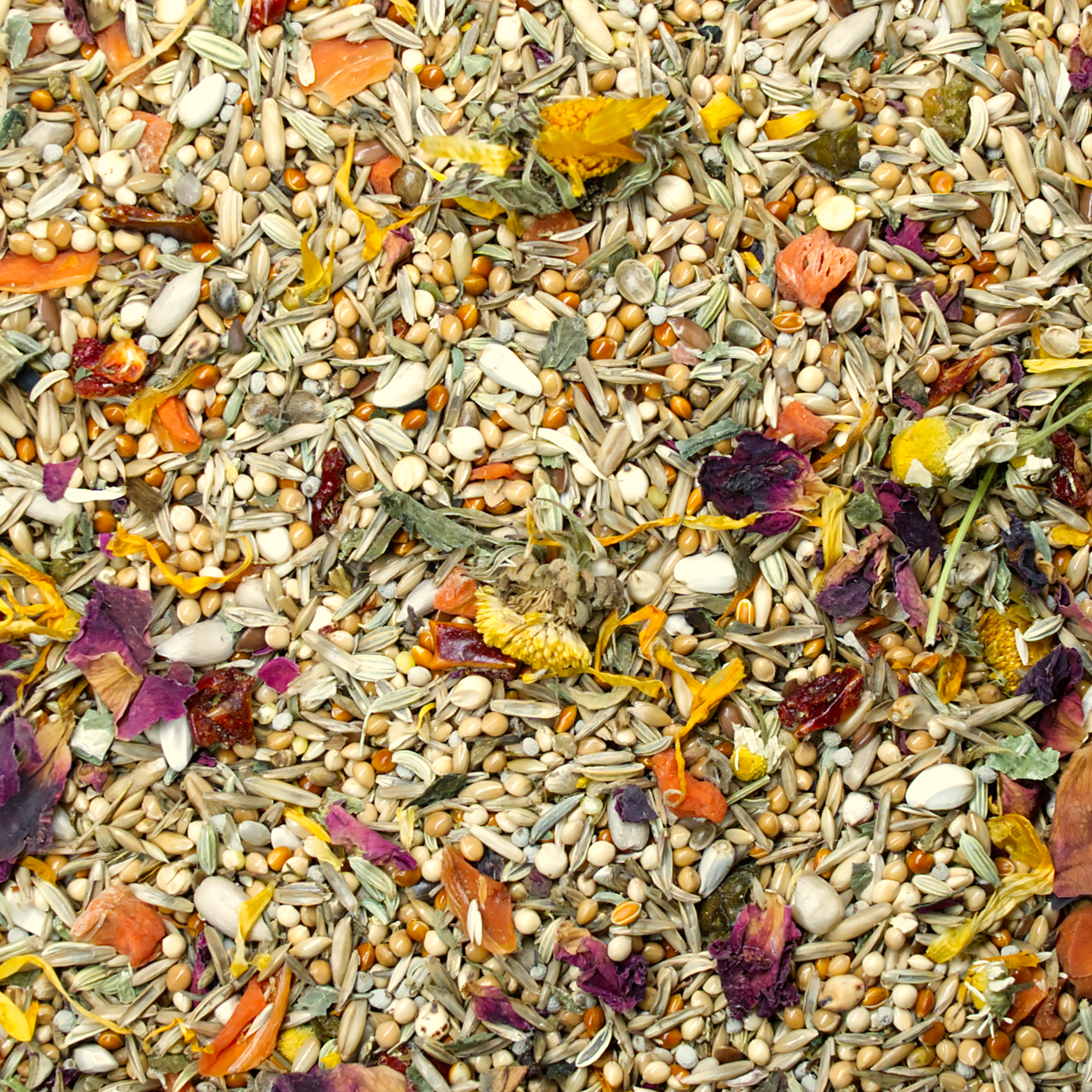 - Naturbelassene Wildsamen und Gräser: Diese Ballaststoffe regen das natürliche Such- und Fressverhalten an und unterstützen die Verdauung.