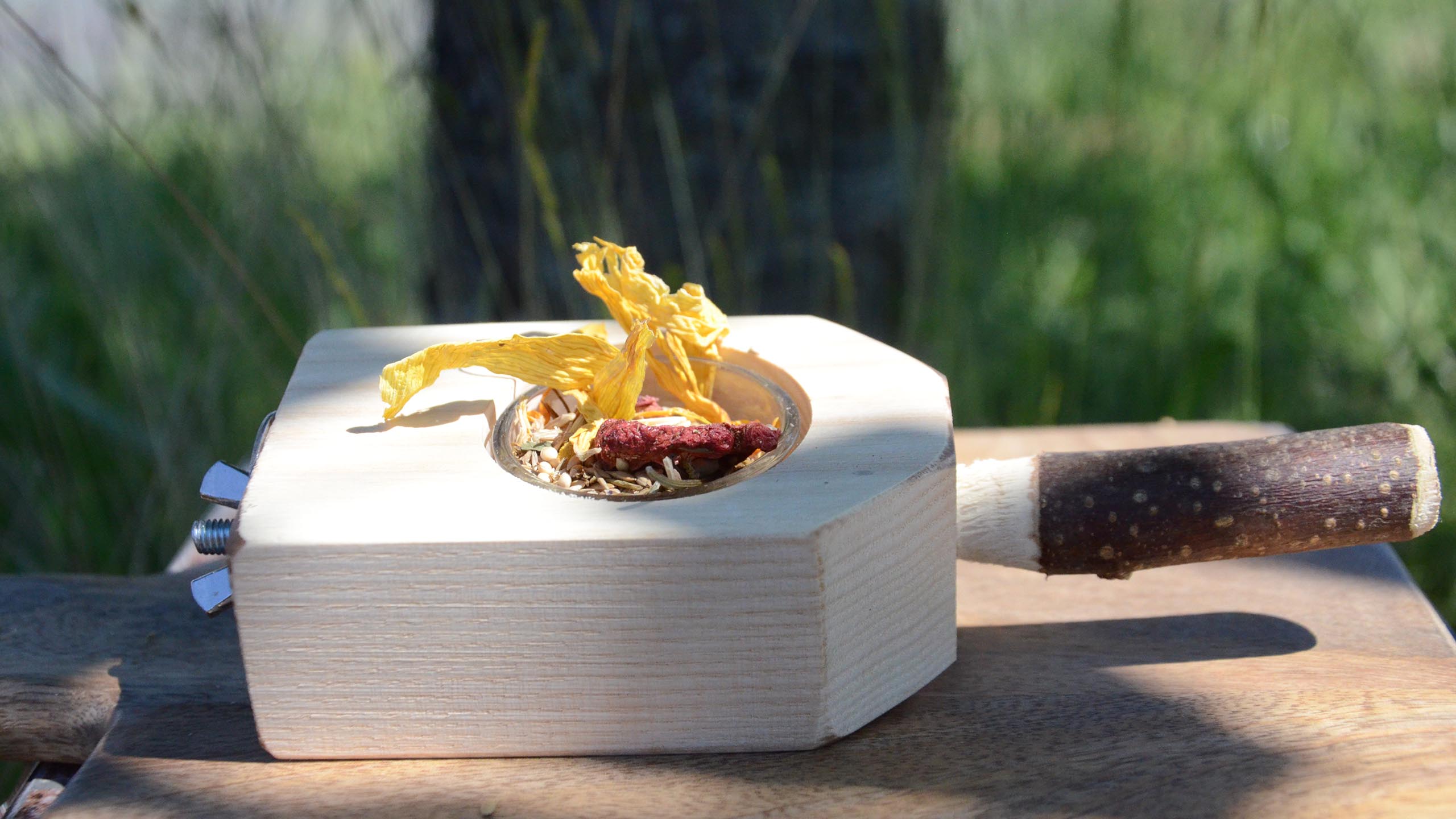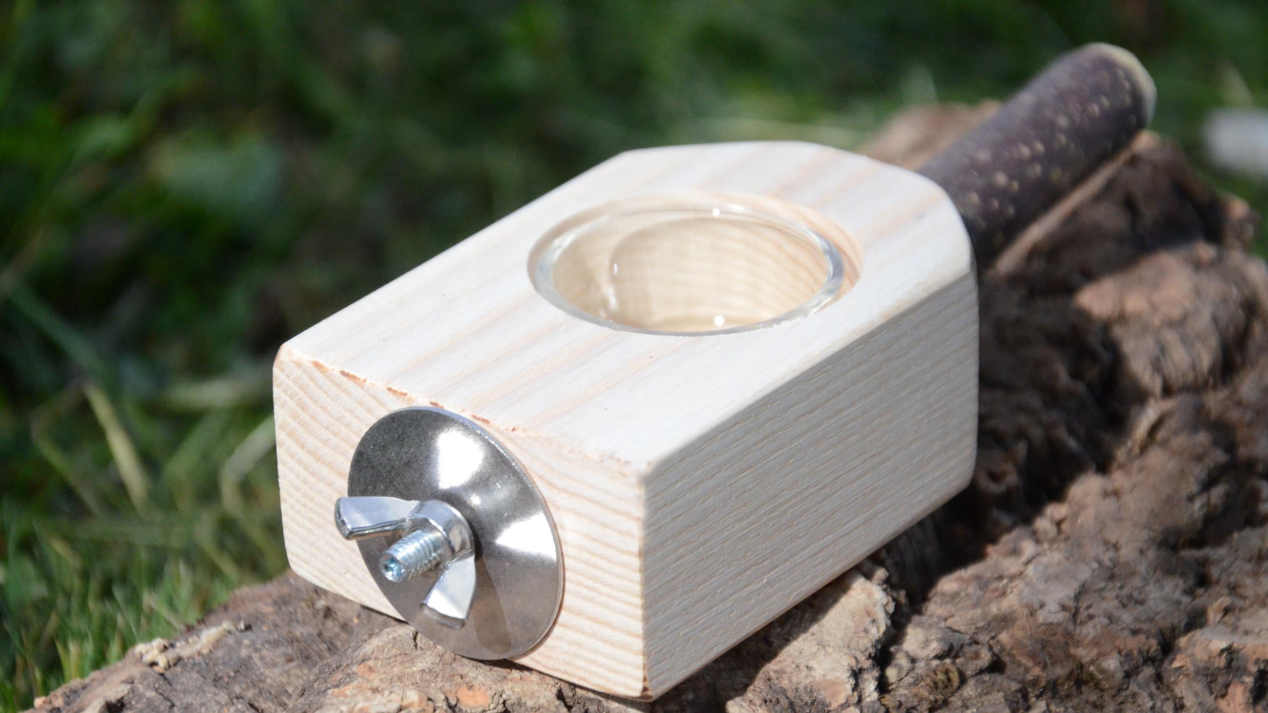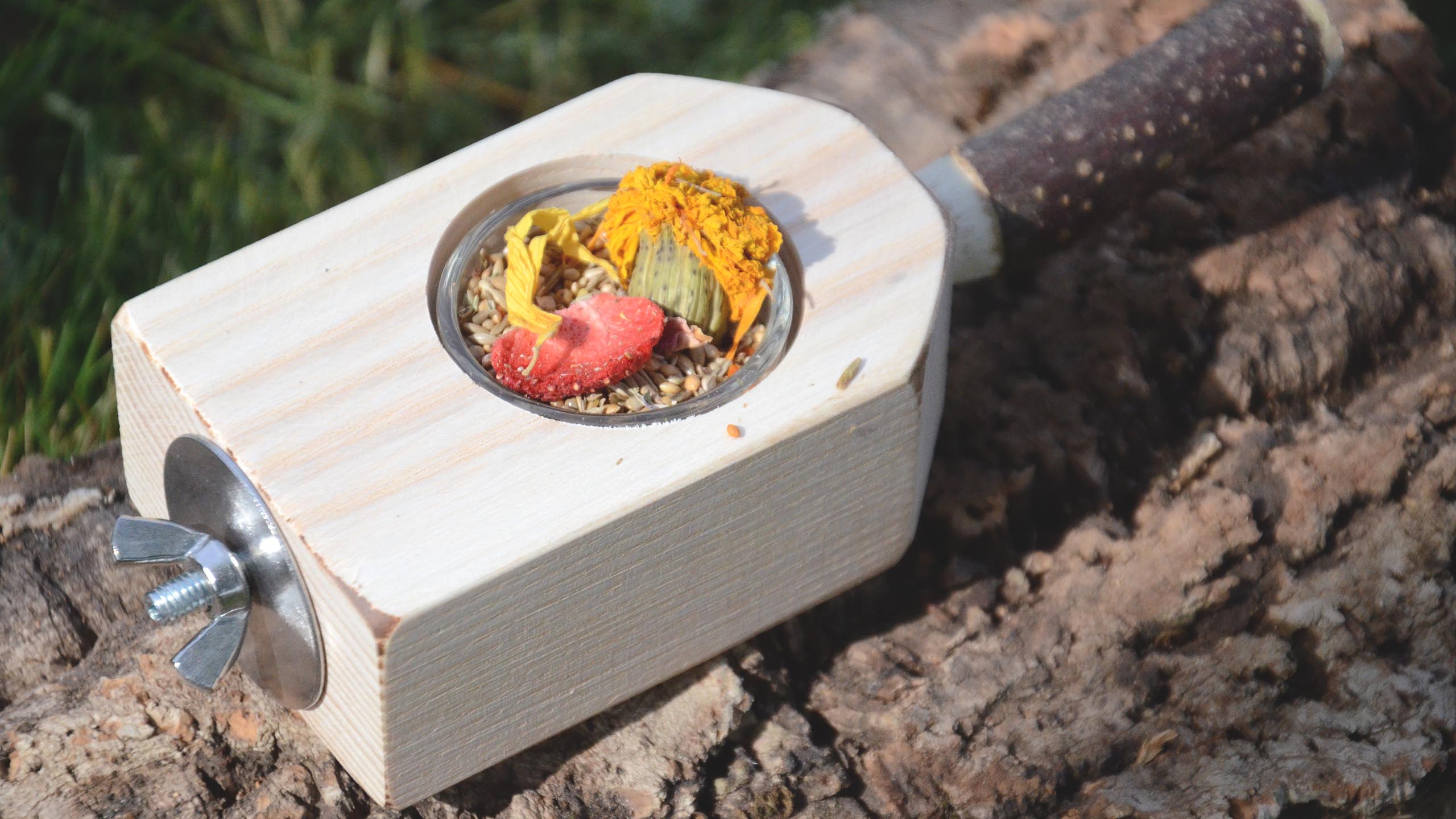Kleiner Futternapfhalter aus Buchenholz mit Sitzstange