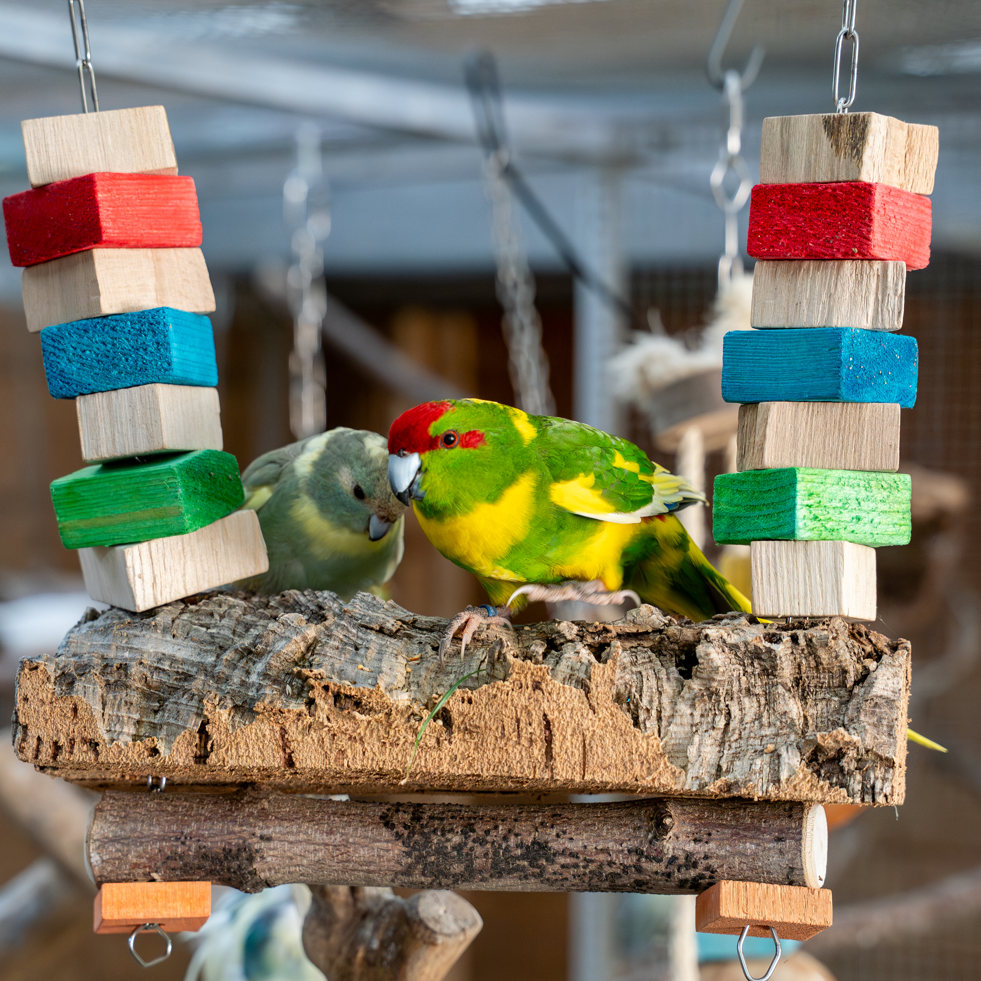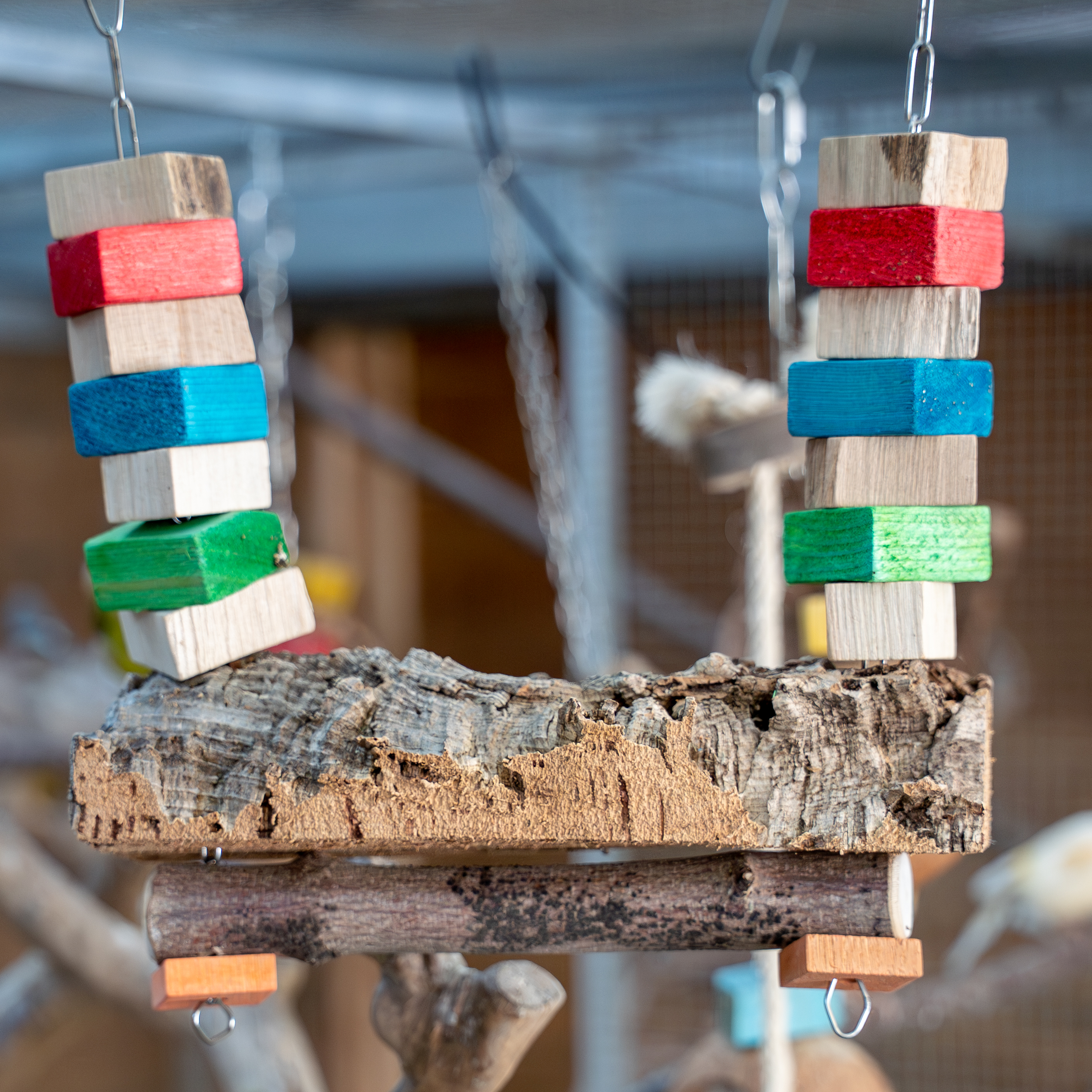 Damit bei den Vögeln keine Langeweile aufkommt, werden immer unterschiedliche Hölzer die sich in Härte, Farbe und Geschmack unterscheiden verwendet. Dies sind z.B.: Buche, Eiche, Fichte, Weide, Linde, Pappel, Eberesche, Birke, u.a. Einige MG Holzspielzeuge enthalten zudem noch Tuffgestein, Lavagestein, Weidenbälle oder MG Mineralsteine. Diese dienen der Schnabelpflege bzw. der Mineralstoffversorgung und werden von den Vögeln gern bearbeitet und gefressen