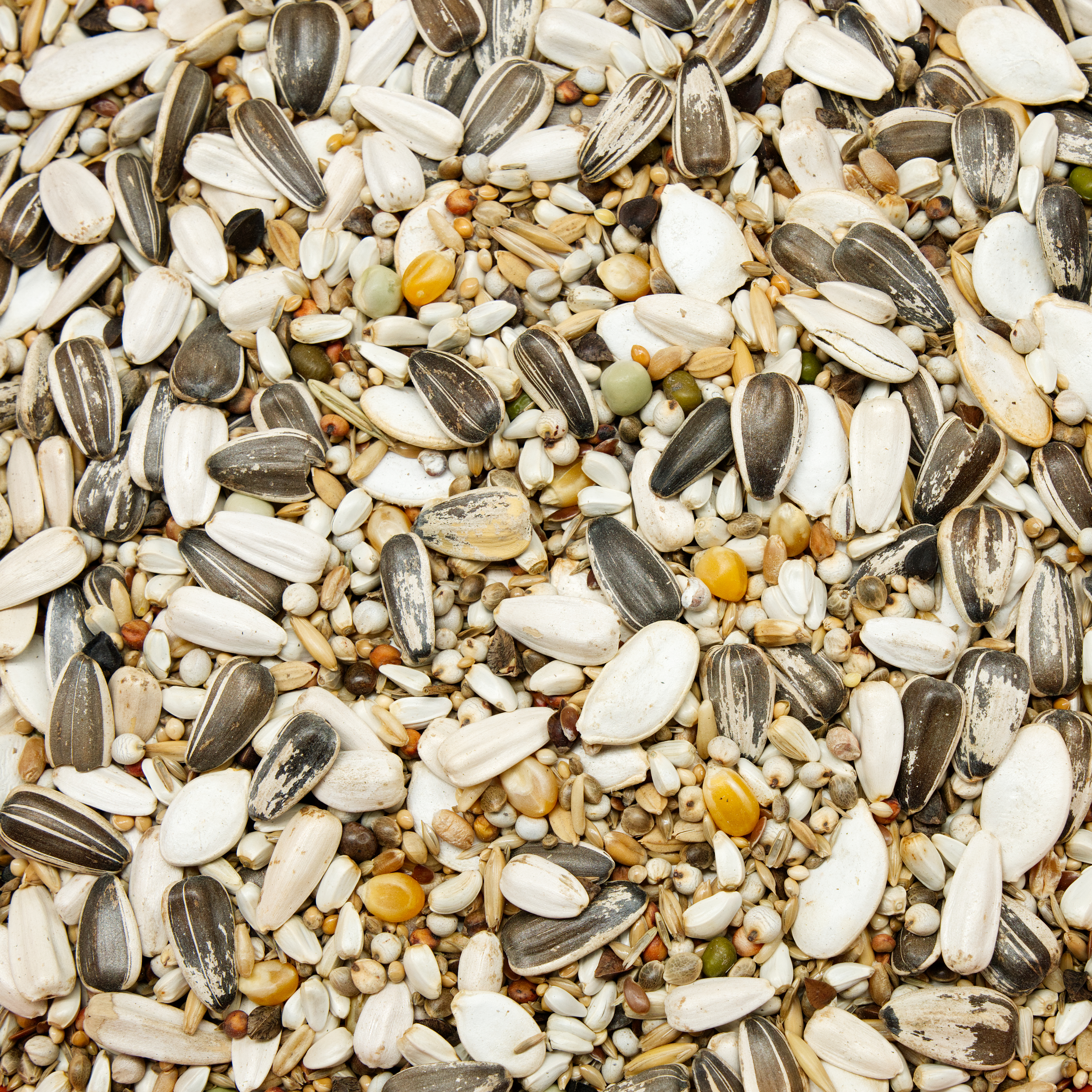 Kardisaat, Sonnenblumenkerne gestreift, Dari weiß, Sonnenblumenkerne weiß, Buchweizen, Hafer ganz geschält, Kanariensaat, Silberhirse, Plata Hirse, Senegalhirse, Hanfsamen, Dari rot, Hafer gestutzt, Französischer Mais, Weizen, Wiesengräser, Leinsamen braun, Paddy-Reis, Hirse gelb, Erbsen grün, Mungbohnen grün, Kürbiskerne, Wicken