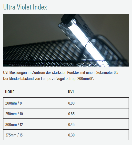 Das Kit wird in Deutschland hergestellt, ist von hoher Qualität und wurde entwickelt, um Vögeln, die in größeren Käfigen leben, ein ganzes Jahr lang die notwendige Vollspektrum- und UV-B-Beleuchtung zu bieten. Die Lampe erzeugt hervorragende natürliche Farben! Das Fress- und Brutverhalten der Vögel wird durch die Nutzung der Lampe verbessert.