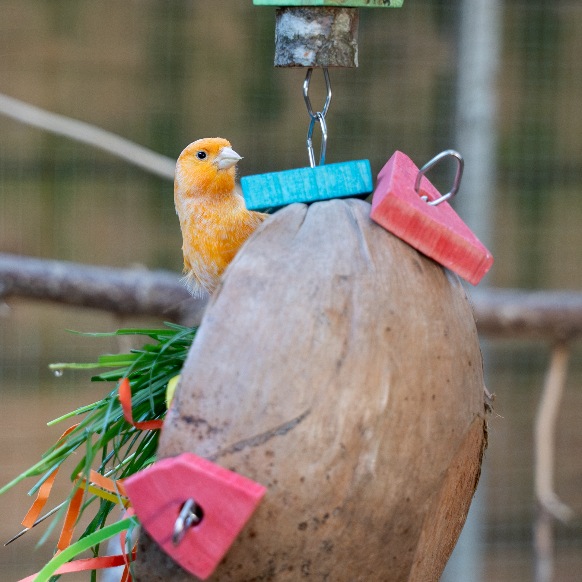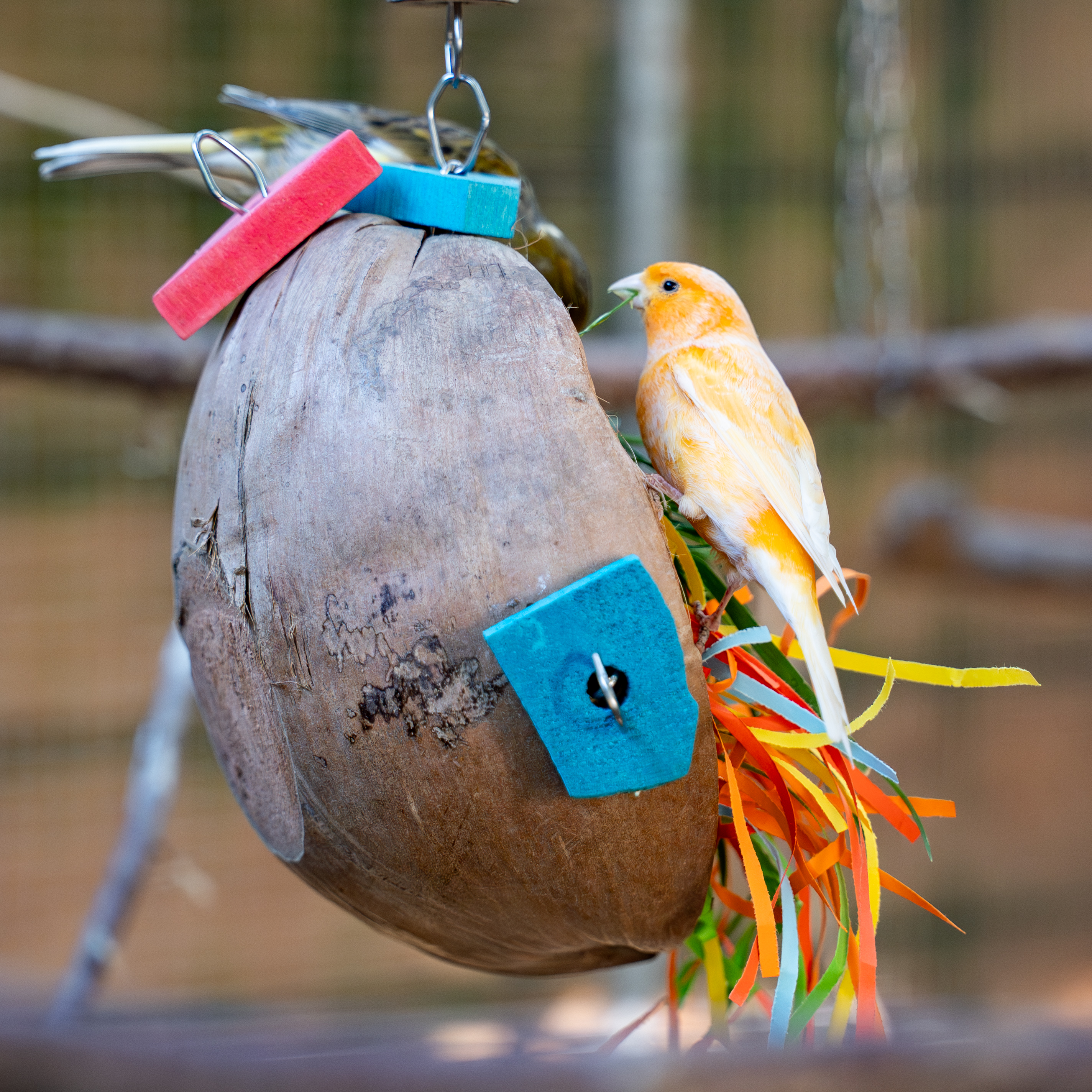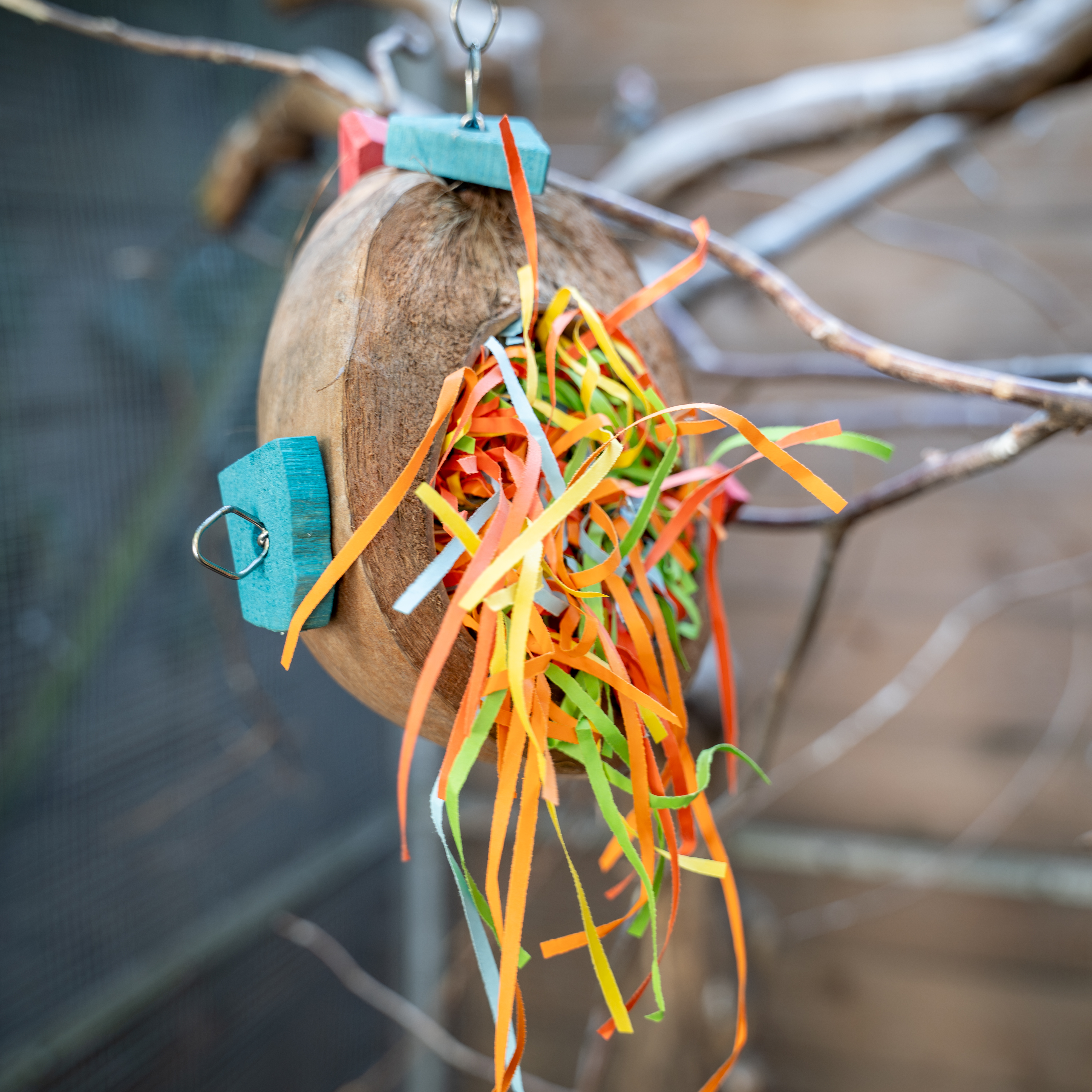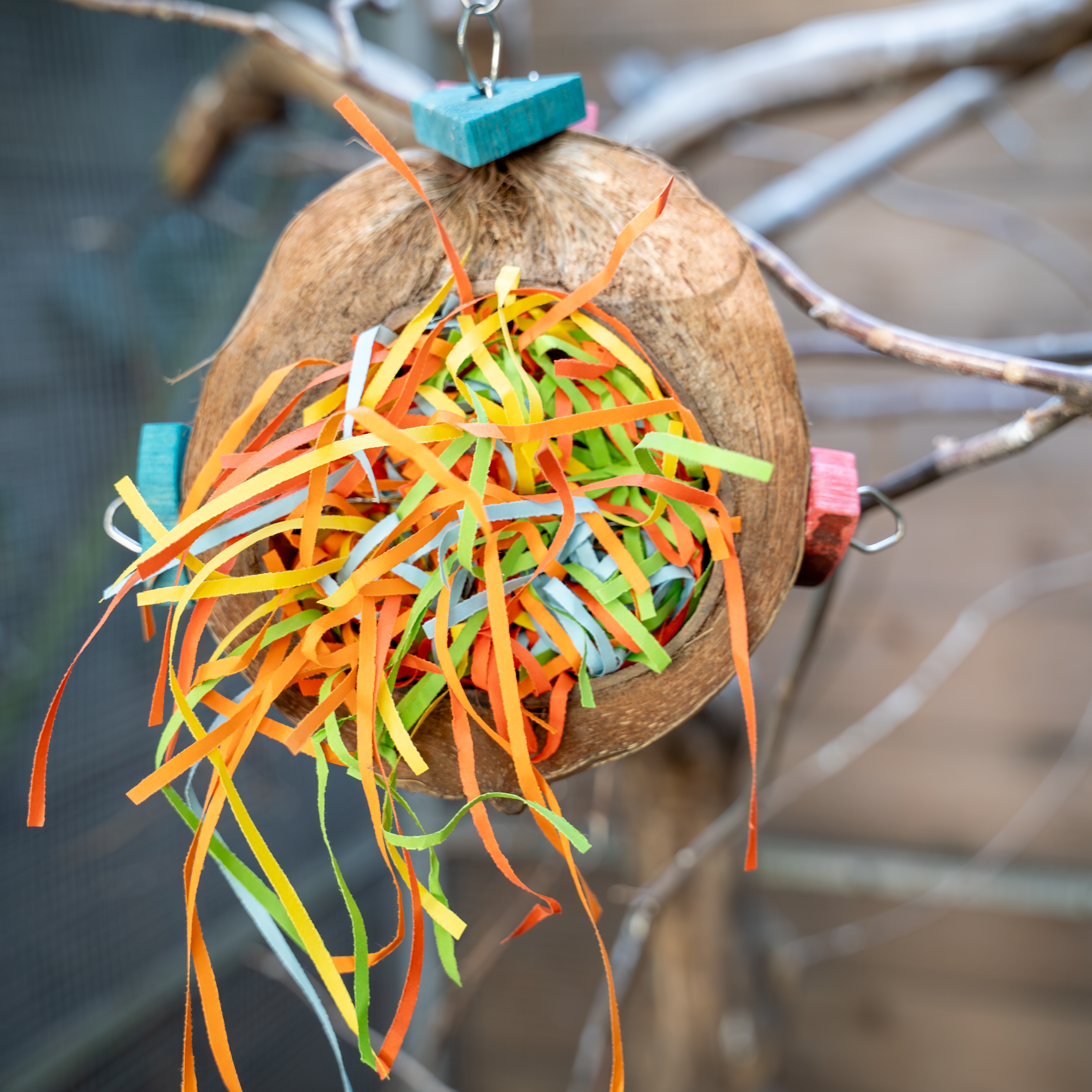 Schredder Bar - wiederbefüllbare Kokosnuss mit Holz und Papierschnipseln für Papageien