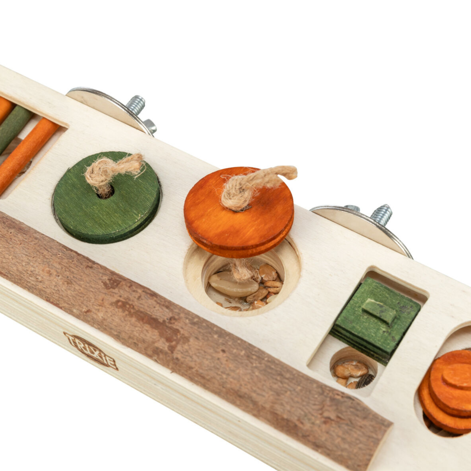 Spielerische Nahrungssuche: Ausgestattet mit Schiebe-Deckeln und Stäbchen, bietet dieses Spielzeug eine spannende Art und Weise für Deine Vögel, an ihre Leckerlis zu gelangen. Durch Ziehen und Schieben werden die Vögel spielerisch an ihre Belohnung geführt, was nicht nur Spaß macht, sondern auch ihre Problemlösungsfähigkeiten schult.