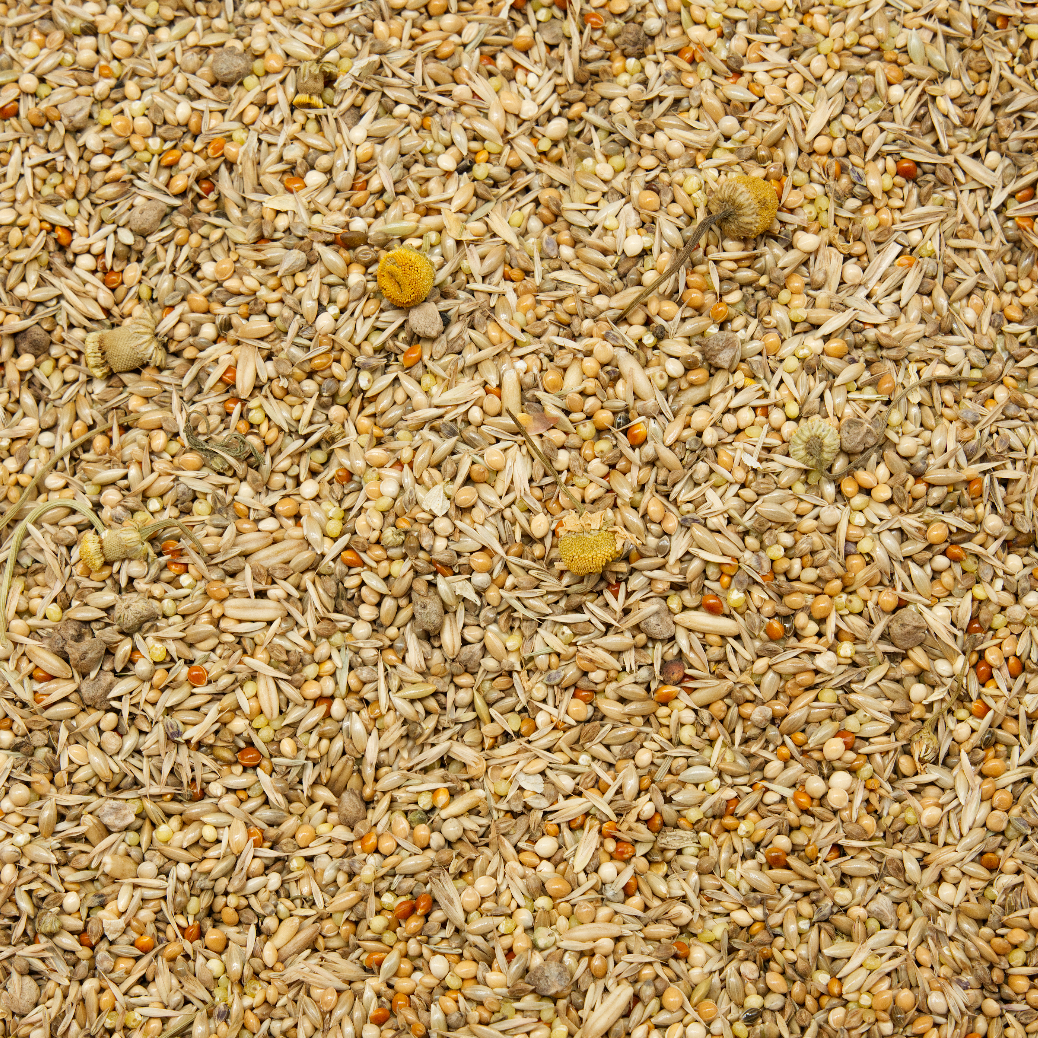 Ausgewogene Mischung für Außenhaltung und Freiflieger mit Kamillenblüten und kleineren Saaten für Wellensittiche.